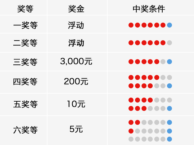 六等奖:投注号码与当期开奖号码中的1个蓝色球号码相同,即中奖。