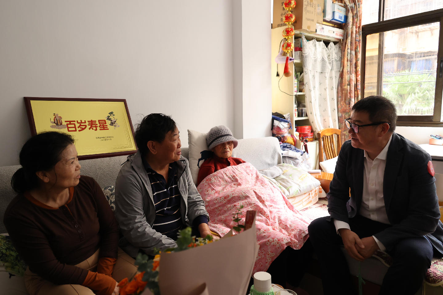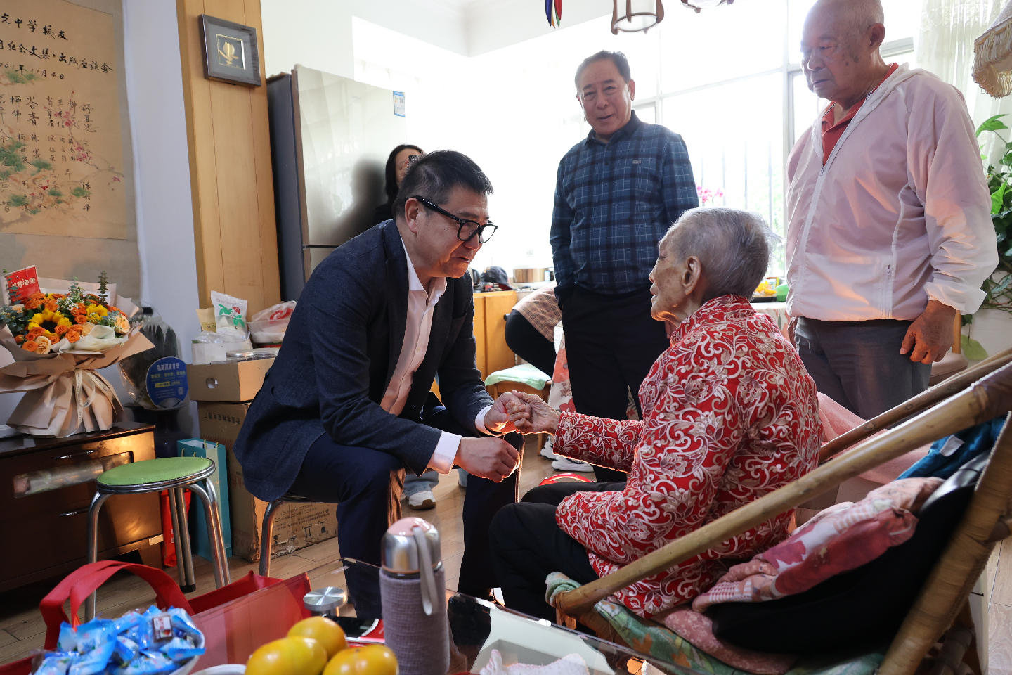 “老人家现在胃口好不好?睡眠质量怎么样?”在104岁的陈桂芳老人家中,慰问组一行与老人的家属亲切交谈,详细了解老人的身体情况和生活状况。叮嘱老人,遇到困难和问题,要及时向社区和相关民政部门反映。