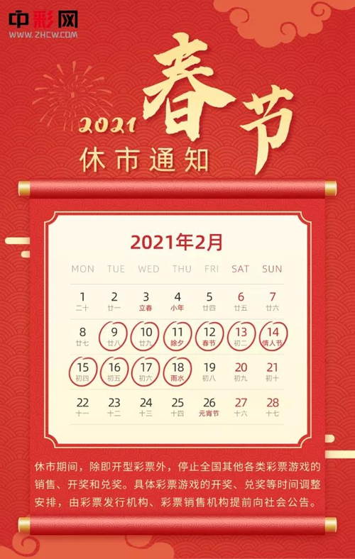 根据《彩票管理条例》及其实施细则、《国务院办公厅关于2021年部分节假日安排的通知》(国办发明电〔2020〕27号)等有关规定,现将2021年彩票市场休市安排公告如下: